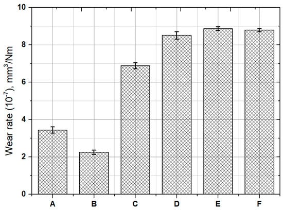 Wear rate calculation results of the control (A), QT heat treatment (B), SP before baking heat treatment (C), Cr-plating and baking heat treatment (D), stripping after Cr-plating and baking heat treatment (E) and re-SP after Cr-plating (F) specimens.