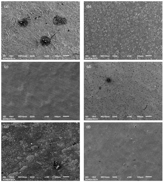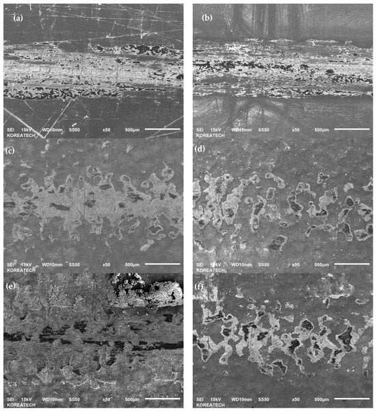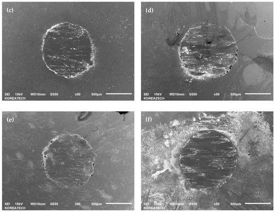 Figure 8 shows the SEM images of the wear track of the specimens. It can be seen that the surface roughness and integrity dominated the wear occurrence. It is clear from Figure 8a,b that a relatively smooth surface demonstrated a high resistance to wear compared to that of the relatively rough surfaces. A partially worn-out surface was observed due to the rough surface after SP, as shown in Figure 8c. The correlation of wear resistance with the hardness of the specimens is clearly shown, but it also depends on the surface roughness. A lower value of wear resistance was obtained for the specimens after SP with high surface roughness (see Figure 3) and high surface hardness (see Figure 4). Figure 8d shows a more partially worn-out surface due to the high Rz value, which is the average value of the absolute values of the heights of the highest-profile peaks and the depths. Despite the lower surface roughness of the stripped after Cr-plating layer specimen, the wear resistance lowered (see Figure 8e), which may be attributed to the lowest surface hardness. Figure 8f, which is the re-SPed specimen, showed a similar wear behavior compared to that of the SPed specimen, as shown in Figure 8c.