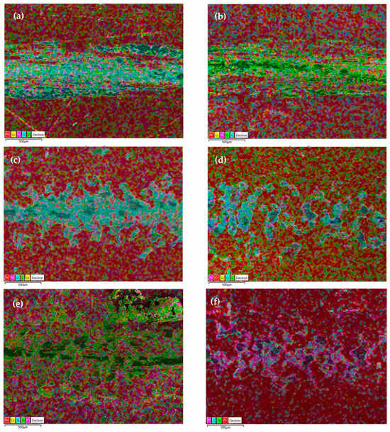 SEM-EDX mapping of the control (a), QT heat treatment (b), SP before baking heat treatment (c), Cr-plating and baking heat treatment (d), stripping after Cr-plating and baking heat treatment (e) and re-SP after Cr-plating (f) specimens.
