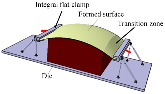 Due to its simple process and low springback, stretch forming has become one of the main methods for producing thin-walled surfaces [15,16], as well as for obtaining large surfaces that are difficult to manufacture by traditional stamping. In conventional stretch forming (SF-C), the sheet metal is gripped by an integral flat clamp, as shown in Figure 1. When a surface with a large curvature is formed, a longer transition zone is required to ensure complete contact with the die. In addition, some areas are excessively stretched and cracked, while others are prone to wrinkling due to compression. The low material utilization and quality product rates result in higher costs for forming curved surfaces.