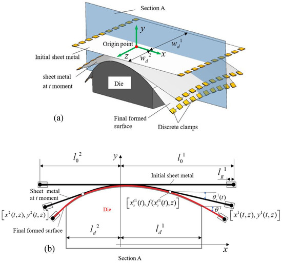 To apply this loading method to any surface, the target surface shape is defined by the function below, while the die’s highest point is the coordinate origin, as shown in Figure 4a. The distance between the longitudinal edge of the die and the coordinate origin is denoted by and , respectively. The initial sheet material’s width is the same as that of the die. The z-coordinates of the die’s transverse edges are denoted by and , respectively. and are used to represent the x-coordinates at both ends of the sheet metal, as shown in Figure 4b. Since the trajectory calculation method for discrete points on both sides of sheet metal is the same, only the discrete point trajectories on the right are analyzed for convenience.