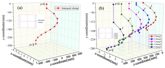 The z-coordinates of the discrete loading points can be inserted into Formula (7) to determine each spatial position. Through controlling the motion of each discrete clamp according to the loading paths described above, complete contact between the sheet and the die can be achieved within a smaller transition zone. Sheet metal deformation and the contact process with the die are controlled, effectively suppressing wrinkling and cracking. Figure 5 (Origin 2018 used, China) shows the motion paths of the clamps in SF-C and SF-CMPC, when a spherical part with curvature radii of 1500 mm, a length and width of 1200 mm is formed.