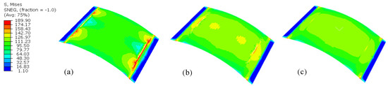 Stress distributions on curved surfaces obtained by SF-CMPC under different transition zone lengths: (a) 50 mm; (b) 150 mm; and (c) 300 mm.