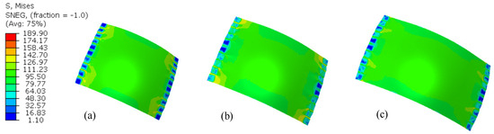 Stress distributions on curved surfaces obtained by SF-C under different transition zone lengths: (a) 50 mm; (b) 150 mm; and (c) 300 mm.