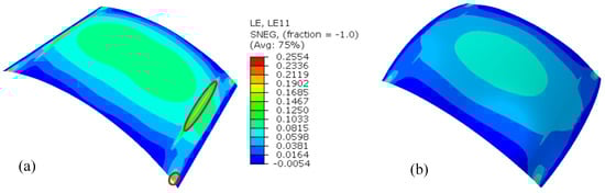In the stretch-forming process, sheet metal deformation is mainly realized by longitudinal stretching and thickness reduction. However, when the sheet metal’s local area is stretched or its thickness reduced to a certain extent, the sheet cracks, not guaranteeing a smooth continuation of production. Indeed, the surface thus obtained does not meet the use requirements. To study the cracking risk of SF-C and SF-CMPC, the two processes were analyzed via numerical simulation. Figure 9 shows the strain distribution on the same surface, formed by different methods. The deformation in the red area is greater than in the other ones. Indeed, when a surface with a large curvature is formed, there is a high risk of cracking. For the convenience of discussion and analysis, this area is defined as the crack danger zone.