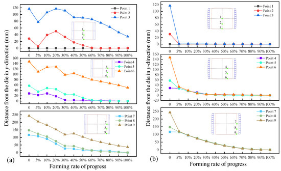 The variation in the distance between the feature points and the die during formation: (a) SF-C and (b) SF-CMPC.