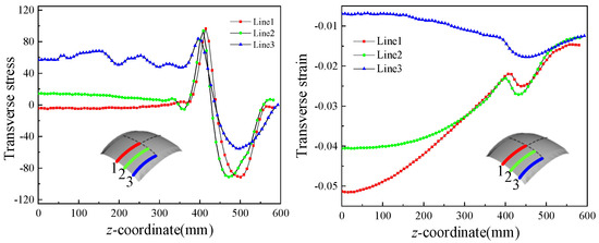 To discover the relationship between the stress and strain distribution on the formed surface, these measures were analyzed alongside die contact and wrinkling. Figure 13 shows the transverse stresses and strains along three characteristic lines on the SF-C surface. The transverse stress variation in the area where the sheet metal touches the die is relatively small, but the stress fluctuation in the suspended area is significant, with a maximum compressive stress of nearly 100 MPa. The compressive strain at the corresponding position increases slightly as a result. Due to insufficient constraints on the suspended sheet material, the ultimate compressive strain is relatively small, making the surface prone to warping and wrinkling.