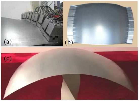 Metal thin-walled surfaces are widely used in aircraft and high-speed train manufacturing because of their light weight and high strength [1,2]. In recent years, to optimize aircraft and train aerodynamics during operation, the proportion of surfaces with large curvatures has gradually increased, requiring a higher production quality. Due to wrinkling, cracking, and large springback tendencies in traditional production, it is difficult to meet current requirements, making new technological research and development around sheet metal formation urgently needed [3,4].
