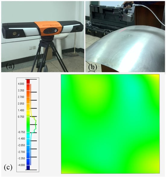 The surface shape was measured using an optical 3D measuring instrument, as shown in Figure 16a. The measurement error of the instrument was less than 40 μm. The scanning process is shown in Figure 16b. The shape of the surface can be determined through measurement data. In comparing the results with the target surface, the formation errors can be obtained. The shape error in the normal direction of the formed surface is displayed in Figure 16c. The normal errors are distributed within the range of −1.4 mm to 1.4 mm, concluding that high-quality three-dimensional surfaces can be obtained based on discrete clamp motion path control.