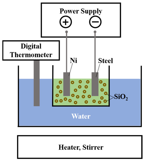 The composite electrodeposition experiment was conducted using a two-electrode system, as illustrated in Figure 1. A nickel plate (60 mm × 40 mm × 5 mm) served as the anode, while ASTM A106B steel (30 mm × 20 mm × 2 mm) functioned as the cathode, with a spacing of 4 cm between them.