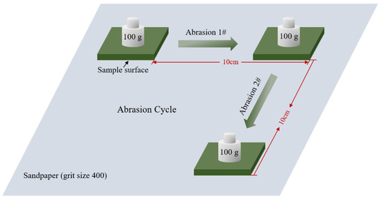 Subsequently, a sandpaper friction experiment was conducted. As shown in Figure 2, a 100 g weight was placed on the coating to apply a constant pressure. The coating surface was placed face down on 400-mesh SiC sandpaper and dragged at a constant speed of 1.4 cm/s. The wear resistance of the coating was characterized by measuring the relationship between the water–oil contact angle and the friction distance on the coating surface.