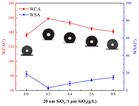 The WCA and WSA of coatings at different concentrations of micro/nanoparticles. The error bars indicate standard deviations.