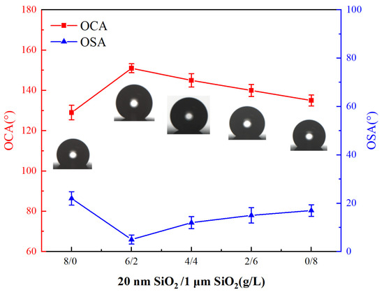 The OCA and OSA of coatings at different concentrations of micro/nanoparticles. The error bars indicate standard deviations.