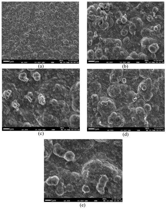 SEM morphology of composite coatings under different particle size–particle concentration ratios: (a) 8/0, (b) 6/2, (c) 4/4, (d) 2/6, (e) 0/8.