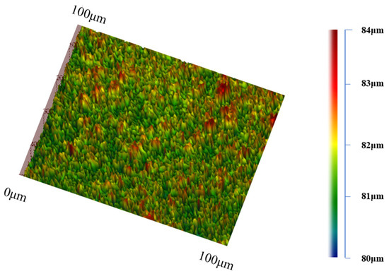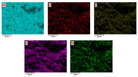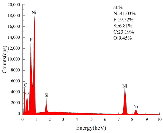 The superamphiphobic coatings obtained at the optimal micro/nanoparticle concentrations (6 g/L for 20 nm SiO2 and 2 g/L for 1 μm SiO2) will be used in subsequent experiments. To determine the elemental composition and content of the Ni-SiO2 superamphiphobic coating, an EDS test was conducted. The results, shown in Figure 7, reveal that the coating comprises five elements: Ni, F, Si, C, and O. Nickel is the most abundant element at 41.03%. Silicon accounts for 6.81%, and oxygen is 9.45%, indicating the successful deposition of silica particles on the coating surface. The atomic percentages of fluorine and carbon are 23.19% and 19.52%, respectively, demonstrating that AC-FAS effectively modified the composite coating surface. Figure 8 presents the distribution map of each element on the Ni-SiO2 coating surface. The uniform distribution of various elements suggests that both the metal ions in the plating solution and the deposition process of SiO2 on the electrode surface during electrodeposition are relatively uniform. This uniformity enhances the coating’s performance and quality. Figure 9 shows the 3D morphology of the Ni- SiO2 superamphiphobic coating surface. The coating surface features protrusions of varying scales, representing the micro/nano dual-scale structure formed by embedded silica particles and nickel. The average surface roughness (Ra) of the coating is 2.23 μm. Figure 10 displays the cross-sectional scanning electron microscope image of the Ni-SiO2 superamphiphobic coating. The thickness of the coating is 14.2 μm, with no noticeable pinholes, cracks, or other defects, indicating strong adhesion between the coating and the substrate.