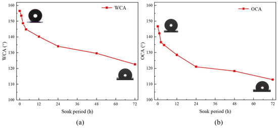 The change in the contact angle of the Ni-SiO2 superamphiphobic coating with immersion time: (a) water contact angle, (b) oil contact angle.
