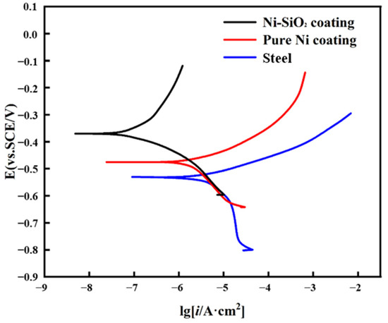 Figure 12 presents the potentiodynamic polarization curves of steel, the pure nickel coating, and the Ni-SiO2 superamphiphobic coating immersed in 3.5 wt.% NaCl solution for 30 min. The corrosion potential (Ecorr) and corrosion current density (icorr) of each sample were summarized in Table 4. Then, the corrosion efficiency of the pure nickel coating and superamphiphobic coating were calculated according to Equation (1). In the formula, icorr,sub and icorr,coated represent the corrosion current density of steel and coating, respectively.