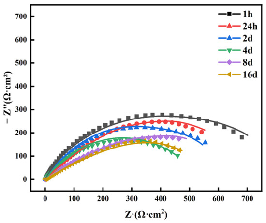 Nyquist plots of Ni-SiO2 superamphiphobic coating immersed for different times.