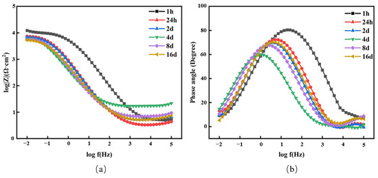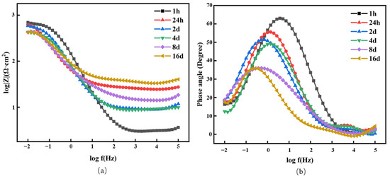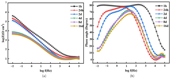 Bode plots of steel immersed for different times. (a) Frequency–impedance plot; (b) frequency–phase angle plot.