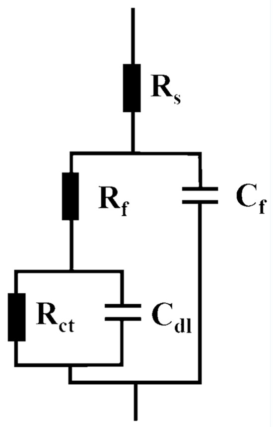 To better understand the corrosion mechanism of steel in 3.5 wt.% NaCl solution, an equivalent circuit is constructed, as shown in Figure 16. Here, Rs represents solution resistance, Rf is the resistance of the corrosion product film on the steel surface, Rct denotes charge transfer resistance, and Cf and Cdl denote the capacitance of the corrosion product film and the double layer capacitance at the interface of steel and the solution, respectively. The fitting values of the AC impedance spectra of each circuit element are shown in Table 5. The charge transfer resistance of steel shows a decreasing trend with immersion time.