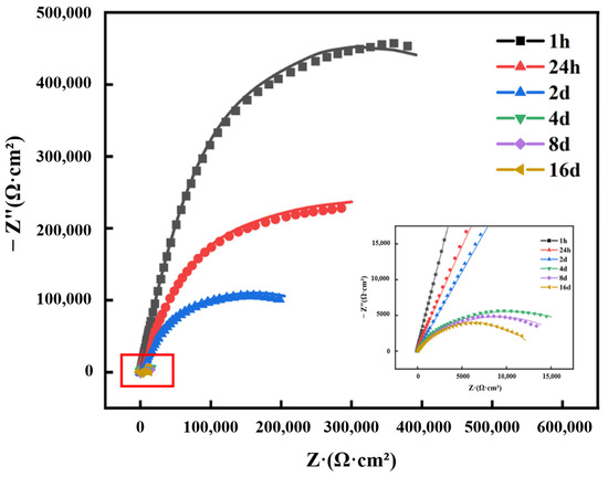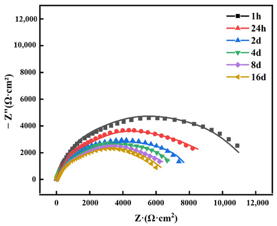 Figure 14 and Figure 15 show the EIS of steel samples in 3.5 wt.% NaCl solution. During the electrochemical corrosion process, the anode undergoes an oxidation reaction, and the cathode undergoes an oxygen absorption reaction. After 16 days of immersion, significant yellow and black corrosion products were observed adhering to the surface of the steel.