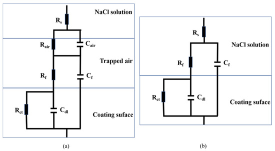 Equivalent circuits of Ni-SiO2 superamphiphobic coating in 3.5 wt.% NaCl solution. (a) initial time, (b) failure time.