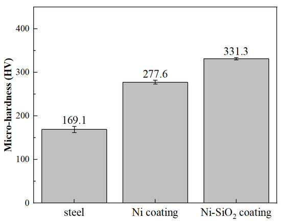 Firstly, the hardness of steel, the pure nickel coating, and the Ni-SiO2 superamphiphobic coating were tested. The hardness of the sample was tested using an FM-800 (D) micro W Vickers hardness tester (FTFuture-Tech, Tokyo, Japan). The pressure loading time was 15 s, and the load was 500 g. Five different points on the surface of each sample were tested for hardness, and the average value was recorded as the final hardness value.