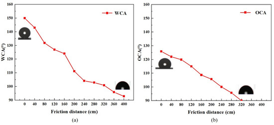 Contact angle of Ni-SiO2 composite superamphiphobic coating under different wear distance: (a) water contact angle; (b) oil contact angle.