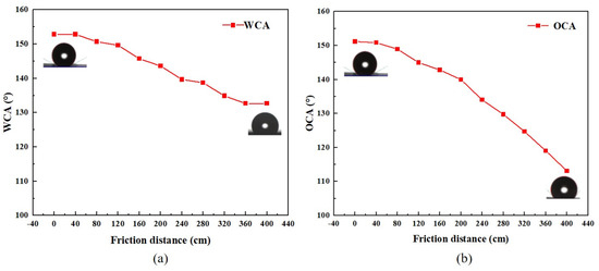 Contact angle of pure Ni superhydrophobic coating under different wear distance: (a) water contact angle; (b) oil contact angle.