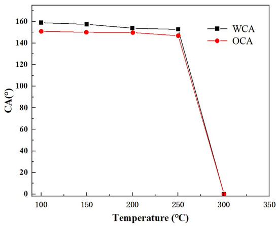 The contact angle of the Ni-SiO2 superamphiphobic coating at different temperatures.