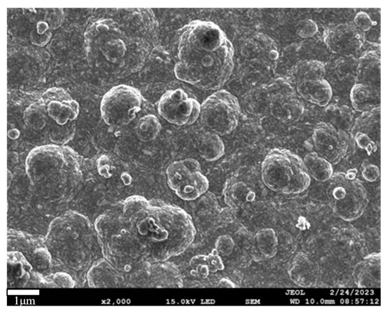 In Figure 5b, at a nanoparticle concentration of 6 g/L and a micron particle concentration of 2 g/L, the surface morphology reveals deep ravines and peaks formed between the micron particles. Figure 6 presents a partially enlarged view of Figure 5b, highlighting how silica particles of both sizes serve as adsorption sites for the crystallization and growth of nickel metal. On the surface of these particles, nickel ions form smaller-scale spike-like structures, and numerous densely arranged nanoparticles populate the ravines between the micron protrusions, creating a micro/nano dual-scale structure that enhances the coating’s amphiphobic ability. At this point, the WCA and OCA are at their maximum. In Figure 5c, with a further reduction in the concentration of 20 nm SiO2 nanoparticles, the surface morphology shows a decrease in nano-scale protrusions, leading to slightly reduced surface roughness and decreased amphiphobic properties.