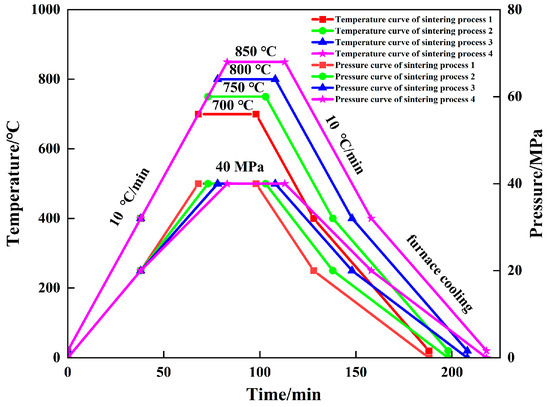 The various powders listed in Table 1 were placed in a vacuum oven(Taisitc Instrument Co., Ltd., Tianjin, China) and dried until a constant weight was achieved. Subsequently, the samples were transferred to a vacuum ball mill(Nanda Instrument, Nanjing, China) for ball grinding at a rate of 250 r/min for 10 h. The resulting powder was then placed in a graphite mold and sintered using an HVRY-3 high-vacuum hot-pressing sintering furnace((Suzhou Hateng Technology Co., Ltd, China). According to the classical sintering theory [22,23], the highest sintering temperature range is 726~866 °C. Consequently, four sintering temperatures of 700, 750, 800, and 850 °C were adopted for this experiment. The holding time was set to 30 min, and the heating and cooling rates were set at 10 °C/min. The maximum applied loading pressure was 40 MPa. The four sintering curves are illustrated in Figure 1. After sintering, the samples were left in the furnace to naturally cool.