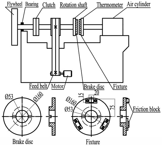 Braking performance was evaluated using a MM3000 friction wear testing machine (SHUNTONG TECH, Xi’an, China) under a dry sliding condition, as depicted in Figure 2. The testing system was powered by a belt that transferred kinetic energy from the motor to the brake disk. The brake disk material used was a high-strength steel alloy (30CrSiMoVA) with a diameter of 175 mm and a thickness of 12 mm. The samples prepared in this experiment were installed on a fixture with dimensions of 20 mm (length), 10 mm (width), and 15 mm (height). During the experiment, the fixture first remained stationary while the braking disk rotated at a pre-set speed. Once the brake disk reached the set speed, the power output was disengaged. Simultaneously, positive pressure (0.8 MPa) was applied by a cylinder to bring the fixture disk into contact with the brake disk, generating friction braking torque to brake. Real-time measurement of friction braking torque was conducted using an appropriate sensor. Based on Newton’s friction formula [24], the real-time coefficient of friction can be calculated as follows: