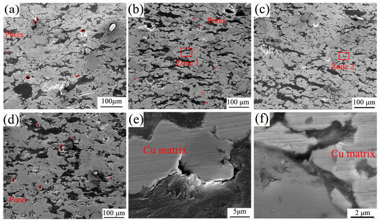 According to the Cu-Sn binary alloy phase diagram [37], the Cu-Sn binary alloy phase is highly complex within the 700 °C to 850 °C temperature range. The structure of Cu-Sn alloys and composites may vary due to changes in the time, temperature, element doping method, and preparation method. Under reasonable soldering temperatures and timescales, intermetallic phases such as Cu6Sn5, Cu3Sn, and Cu41Sn11 can be formed through solid or semi-solid diffusion processes within the Cu/Sn system [38,39,40]. In this study, with a copper-to-tin ratio of approximately 97:3 and based on front XRD test results for samples S700/S750/S800/S850, no compound phases were detected. However, given that Sn has a low melting point and remains in a liquid state during the sintering process, it is possible that some copper–tin IMCs exist in composite materials. The morphology and brightness differences observed at spot 4 in Figure 10a indicate the formation of copper–tin compounds, distinct from those observed in the composite. Point scanning conducted on this zone (Figure 10e) only detected the presence of Cu and Sn, with an atomic mass ratio close to 96% being found for Cu, while the value found for Sn was 4%. The peak positions for compounds containing 97% Cu and 3% Sn are very similar to those of α-Cu, making them difficult to distinguish via the use of XRD alone [41]; hence, it can be concluded that spot 4 primarily contains a Cu97Sn3 intermetallic phase. The mass percentage of copper–tin in this study was approximately 94:6, which falls significantly below the maximum solid solubility of tin in copper at 15.8 wt.%. However, due to element doping and non-equilibrium solid-state diffusion, the solid solubility of Sn in the copper matrix is affected, resulting in the formation of Cu97Sn3 IMCs. So, incorporating appropriate amounts of Sn into a copper matrix can reduce porosity while strengthening soft copper matrices via solution strengthening, along with second-phase strengthening.
