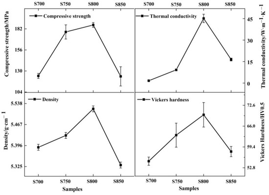 Figure 6 shows the changes in density, Vickers hardness, compressive strength, and thermal conductivity in relation to the sintering temperature. As the sintering temperature increased, the density initially increased and then decreased, with the maximum value being reached at 800 °C. The thermal conductivity, hardness, and compressive strength follow the same trend as the density. This is consistent with the change in porosity in the microstructure of the composites, as mentioned above.