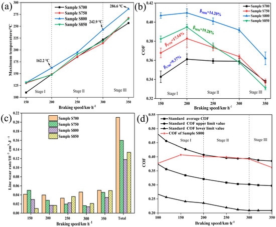 To observe the influence of friction and wear performance on four different sintering samples, the COF, friction temperature, and line wear rate of the four samples were tested consecutively at different braking speeds ranging from 150 to 350 km/h. We divided the figures into three stages according to the different initial braking speeds. Stage Ⅰ, Ⅱ, and Ⅲ were named the low-speed period (≤200 km/h), middle-speed period (200~300 km/h), and high-speed period (300~350 km/h), respectively. Figure 7 shows the results. Based on Figure 7a, it can be seen that the maximum subsurface temperature increased almost linearly with the increase in initial braking speed. The subsurface temperature increases to nearly 300 °C at 350 km/h. At every stage, the temperature curve of sample S800 exhibits the highest values due to its superior thermal conductivity, enabling more efficient transfer of heat from the friction surface into the subsurface. Figure 7b clearly shows that the COFs of all four samples remain relatively stable at stage Ⅰ and Ⅱ but decrease rapidly at stage Ⅲ. By examining the wear rates of the four samples (see Figure 7c), it can be seen that within the speed range of 150 to 300 km/h, the wear rate remains relatively stable; however, when speeds exceed 300 km/h, the line wear rates of the four samples all increased markedly. This effect is closely related to the reduction in shear strength caused by the softening of the material surface and an increase in temperature.