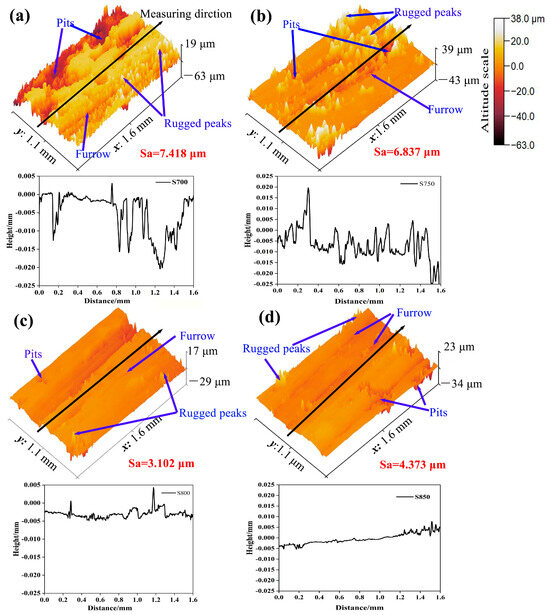 Figure 8 depicts the 3D morphology of the four samples following braking tests conducted at speeds ranging from 150 to 350 km/h. The location indicated by arrows in the middle of each sample is the location at which the roughness was measured. It can be seen that the surfaces of the four samples exhibit certain pits and rugged peaks. Among the four samples, sample S700 exhibits numerous large pits and rugged peaks on its surface, and the furrows on the surface are also deep, meaning this sample has the highest surface roughness (Sa), 7.418 μm, and the maximum height difference is nearly 82 μm (from 19 μm to 63 μm, Figure 8a). In contrast, the friction surface of sample S750 gradually becomes smoother, with smaller pits and peaks, and the furrow depth on the surface is also relatively shallow (Figure 8b). Sample S800 displays the most even surface among all four samples, with Sa 3.102 μm and 46 μm height difference (Figure 8c). Sample S850 also demonstrates relatively smooth characteristics overall; localized pit formations contribute to an increase in average roughness (Figure 8d). The analysis results presented above indicate that, under identical braking friction conditions, the wear rate of S800 is markedly lower than that of the other samples. This is directly related to the strength of the material itself. When the material has greater strength, its wear resistance is better, and, therefore, the surface roughness value is smaller.