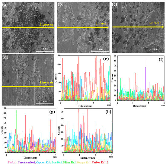 Surface element analysis of the four samples was conducted through energy spectrum line scanning, and the results are shown in Figure 9. As shown in Figure 9e–h, the surfaces of the four friction samples were found to be composed of the following elements: Sn, Cr, Cu, Fe, Si, O, and C. Notably, the peak value of the C element in S700 is the highest (indicated by the red line in Figure 9), with C distributed across almost all of the surface. This phenomenon can be attributed to the lower surface diffusion energy at 700 °C and poor sample strength, leading to easier detachment and scattering of graphite along the friction surface during braking. Consequently, S700 exhibits a correspondingly low COF due to graphite lubrication, consistent with findings from Figure 7b. Furthermore, oxygen elements are present in all four samples (as indicated by the yellow line in Figure 9), indicating relatively severe surface oxidation resulting from high-speed braking.
