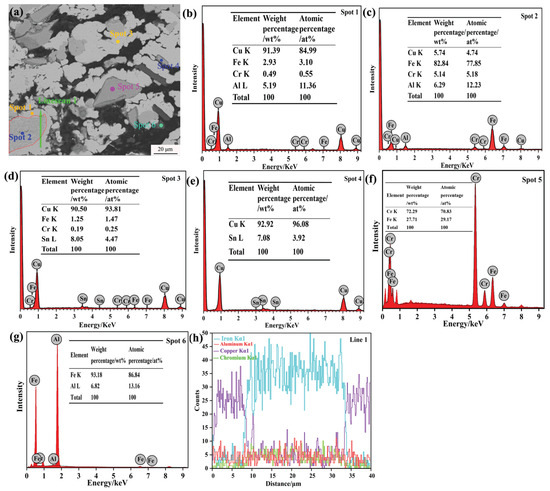 Micromorphological observation and energy spectrum analysis were conducted on sample S800, with point and line scanning performed in different elemental regions, as depicted in Figure 10a, to determine its composition and morphology, as illustrated in Figure 10b–g. It can be observed that the white areas of spots 1 and 3 in Figure 10a exhibit a copper matrix. The light gray area where spot 2 is located consists predominantly of iron, and spot 3 and spot 5 contain Cr3Fe and Fe3Al, respectively. All metal particles in the brake pad composition are uniformly dispersed within the soft copper matrix, playing a particle-strengthening role, but a small amount also forms solid solution phases due to insufficient diffusion during hot press sintering—a solid or semi-solid sintering process [36]. Figure 10b–d,h show clear evidence of interdiffusion among metal elements, as follows: for instance, traces of Cr/Fe/Al can be observed within the copper matrix (spots 1 and 3), and the Fe particles (spot 2) exhibit traces of Cr, Al, and Cu within their lattices, encapsulated by the copper matrix (spot 1). The solid solution of metal elements Fe, Cr, Sn, and Al in the copper matrix causes distortion of the lattice, thereby achieving a solution-strengthening effect.