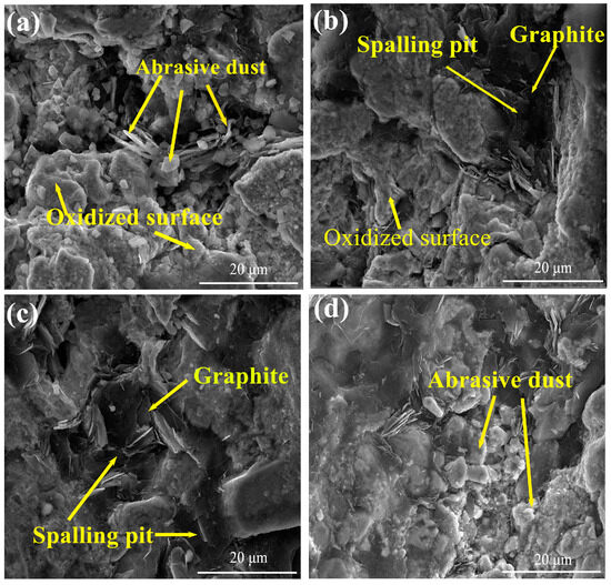 We randomly selected zones on the surfaces of the four samples and observed the morphologies of pits and grinding chips to compare differences in wear mechanisms, and the results are shown in Figure 11. It is evident that all four samples exhibit numerous oxide layers, but the surface morphology of spalling pits differs. The friction surface of S700 reveals an abundance of granulated and lamellar abrasive particles filling cracks. In contrast, both the S750 and S800 samples demonstrate a significant reduction in granular debris due to their superior strength, with distinct spalling pits surrounded by sheets of graphite resulting from the ejection of hard particles. However, plowing on the S850 sample led to further insights, with noticeable abrasive dust particles being present on the surface. This variation can be attributed to the material’s strength influencing friction layer morphology. When a hard brake disk slides on these samples’ surfaces, microcracks occur beneath due to continuous plastic deformation under stress and temperature fields. Flake chips peel off from the friction surface when cracks reach critical lengths. Crack expansion occurs more easily when the strength is lower. Hence, the wear mechanisms for S700 include severe delamination wear, abrasive wear, and oxidation wear, while those for S750, S800, and S850 mainly include abrasive wear and oxidative wear.