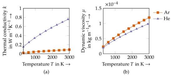 The macroscopic material properties for the process gases Ar and He are given in Table A3 in the Appendix B. A polynomial fit for the thermal conductivity and a power function for the dynamic viscosity were used (see Figure 2). The density and the specific heat capacity were assumed to be constant over the temperature range. A volume-weighted average was used for the Ar-He gas mixtures. For example, the thermal conductivity for such a gas mixture was calculated by