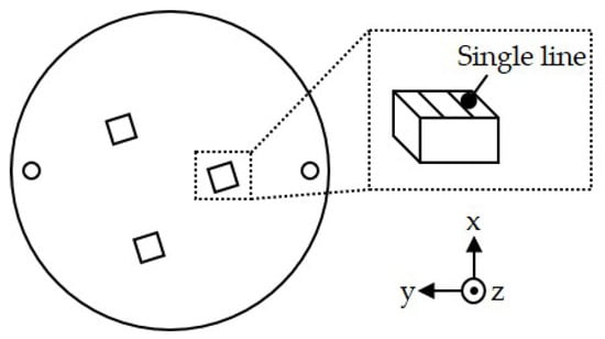 The build job layout for the experiments consisted of three randomly distributed cubes with a size of 10 mm × 10 mm × 8 mm with two single lines each on the top layer (see Figure 3). The laser power P and the scan speed v as given in Table 1 were applied. This parameter combination has reportedly shown to provide a stable process window for Al single lines [43]. The hatch distance h and the layer thickness t were set to 80 µm and 30 µm, respectively. This resulted in a volumetric energy density = of approximately 104 J/mm³. The scanning strategy was parallel stripes with a rotation of 67° per layer. This parameter combination showed a high relative density of >99.5% in preliminary trials. For the build jobs, four gases were applied with a velocity of 1.5 m/s: Ar, He, 70 vol.-% Ar + 30 vol.-% He (ArHe30), and 30 vol.-% Ar + 70 vol.-% He (ArHe70). The oxygen level within the build chamber was kept below 500 ppm.