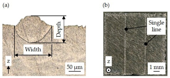 After the build job, the cubes were sawed off the build plate and were further processed via metallography. Firstly, they were cold embedded using a resin (EpoFix Resin, Struers GmbH, Willich, Germany) and a hardener (EpoFix Hardener, Struers GmbH, Willich, Germany) in a ratio of 25:9. The subsequent grinding and polishing followed a four-step procedure: (1) grinding with a 220 grit grinding paper, (2) 9 µm polishing, (3) 3 µm polishing, (4) 1 µm polishing. In the final post-processing step, the cubes were chemically etched for 15 s by the immersion technique using an etchant consisting of HNO3, HCl, and HF in water (Keller-Wilcox, Bernd Kraft GmbH, Wetzlar, Germany). To measure the penetration depth of the single lines, the etched cubes were measured by optical light microscopy (VHX-5000, Keyence Deutschland GmbH, Neu-Isenburg, Germany). The measuring procedure and a top view indicating the fabricated single lines are depicted in Figure 4.