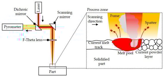 The measuring spot had a diameter of about 200 µm in the setup used. A simplified scheme of the experimental setup is given in Figure 5. It shows the optical path of the setup and a magnified process zone outlines possible sources of heat radiation detected by the pyrometer: the melt pool, the by-products (fumes and spatters), and the surface of the current layer.