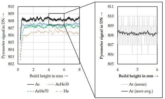 Figure 6 depicts the results from the pyrometer measurements. For the representation, the moving average with a period of ten of the mean values of the pyrometer data calculated per layer was displayed. The results showed that the heat radiation emitted from the processing zone differed only slightly between the gases studied. With an increasing fraction of He in Ar, decreasing temperatures were found. Also, an increasing temperature between the start of the build job at 0 mm and a build height of 1 mm could be observed. After that, a stationary temperature established itself. This is typical for the PBF-LB/M process and was described, for example, by Chaudry et al. [45]. In the first layers, an intense heat conduction into the build plate occurs. With an increasing build height, this effect decreases, and additionally, the isolating powder bed prevents further cooling by convection. Thus, heat accumulation appears.