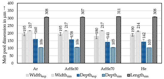 The results from the measurements of the melt pool dimensions in the case of a gas flow are summarized in Figure 7. The mean data received from the experiments and simulations of each gas are depicted with their standard deviations. As it can be seen, the widths of the melt pools were generally larger compared to the depths for all gases. This indicated a conduction melting regime during the process in accordance with the study of Kempen et al. [46]. Only little differences occurred between the gases for the melt pool widths and depths. The experimentally determined melt pool widths and depths varied in the range of 180–195 and 141–160 , respectively. Also, decreasing values of the standard deviation of the melt pool depth measurements could be observed from Ar to He in the experiments. The numerical results showed widths in the range of 214–217 and depths in the range of 103–106 . In addition to the experimental data, the melt pool lengths could be extracted from the simulations. These are depicted in Figure 7 but showed no significant differences between the gases.