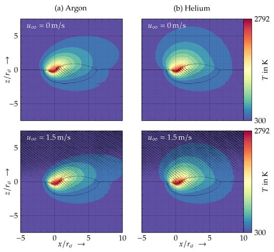 The temperature fields and melt pool morphologies through the x-z plane for Ar and He are shown in Figure 8 for different gas flow conditions (i.e., with and without gas flow). No significant differences in the melt pool shapes were observed for all investigated process gases and flow conditions. Therefore, it can be concluded that the increased heat transfer between the gas and the melt pool due to convection has no significant influence on the dynamics of the melt pool.