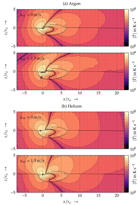 The absolute temperature rate-of-change fields (i.e., the heating and cooling rates) in a logarithmic scale through the x-z plane for Ar and He and different flow conditions (i.e., with and without gas flow) are given in Figure 9. The thermal gradients and cooling rates are essential metrics for assessing the manufacturing process as they are responsible for the final microstructure that is characteristic for PBF-LB/M [47]. The spatial distribution of heating and cooling rates is generally unavailable from an experiment and can only be investigated from a numerical simulation.