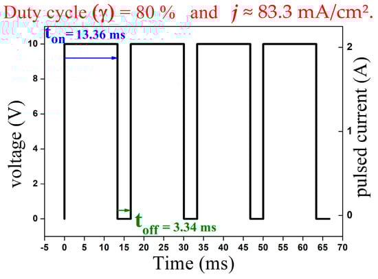 where is the period during which the signal or current is active and is the period during which it is inactive. Figure 1 shows a graph exemplifying the dynamics of the duty cycle ( of the application of pulsed current in the electrodeposition of Cu-NTCPMs where and ; thus, = 80%. Considering the surface area of the working electrode of 24 cm2 and the current of 2 A, the current density (j) applied in the process is equal to ≈ 83.3 mA/cm2.