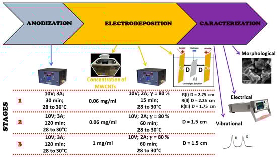In Stage 1, the electrodeposition process utilized a pulsed current source delivering 10 V and 2 A to the system, with = 80% for 15 min within a temperature range of 28 °C to 30 °C. Additionally, Stage 1 included three experiments with electrode-to-sample distances varying between 2.75, 2.25, and 1.75 cm, and the concentration of MWCNTs used was 0.06 mg/mL. In Stage 2, the voltage, current, and duty cycles were kept constant, but the deposition time was extended to 60 min using an electrode-to-sample distance of 1.5 cm. Finally, in Stage 3, with the optimal parameters selected, the concentration of MWCNTs in the electrolytic solution was increased to 1 mg/mL, and the pulsed current source injected 10 V and 2 A into the system with a = 80% over a period of 120 min, with an electrode-to-sample distance of 1.5 cm. Figure 2 shows a flowchart of the experiments and procedures conducted, along with the parameters employed.